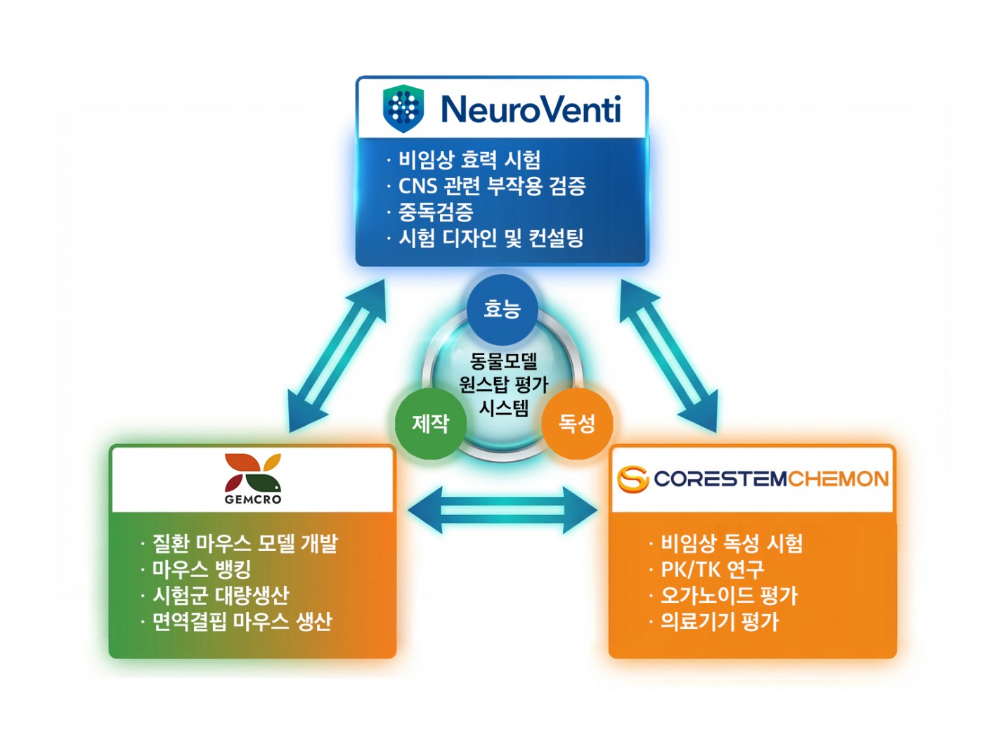젬크로는 최신 유전자 가위 기술 등을 활용하여 인간암세포이식(CDX) 및 인간화마우스 개발에 필수적인 N2G와 항체의약품 PK 평가 모델인 hiFcRn을 상용화한 바 있으며, 이와 같은 신약 효능 평가에 최적화 고도화된 '질환모델마우스'를 제작 및 공급한다. 뉴로벤티는 젬크로에서 제작한 질환 모델 등을 활용하여 약물의 약효를 측정하는 '효능평가'와 약물이 작용하는 '기전연구', 의존성 평가 및 중독검증을 수행하며, 질환에 대한 지식과 노하우를 더하여 젬크로 질환 모델 제작과 실증에 도움을 준다. 특히 뉴로벤티가 최근 중점적으로 추진 중인 론드플러스(ROND+) 신약후보물질 가치증진 플랫폼을 통해 바이오텍 기업과 연구자들의 초기 아이디어에 임상 개발이 가능한 데이터 패키지를 결합하고, 최적의 개발 전략을 제시함으로써 사업기회의 확산을 촉발하게 된다. 코아스템켐온은 신약 후보물질의 안전성 확보를 위한 비임상 독성시험을 수행한다. 설치류(랫드, 마우스)부터 비설치류(개, 미니피그 등)에 이르는 실험동물을 활용하여 규제 기관의 기준에 부합하는 GLP 독성 평가를 전담함으로써 신약 개발 기간 단축과 성공 가능성을 지원한다.