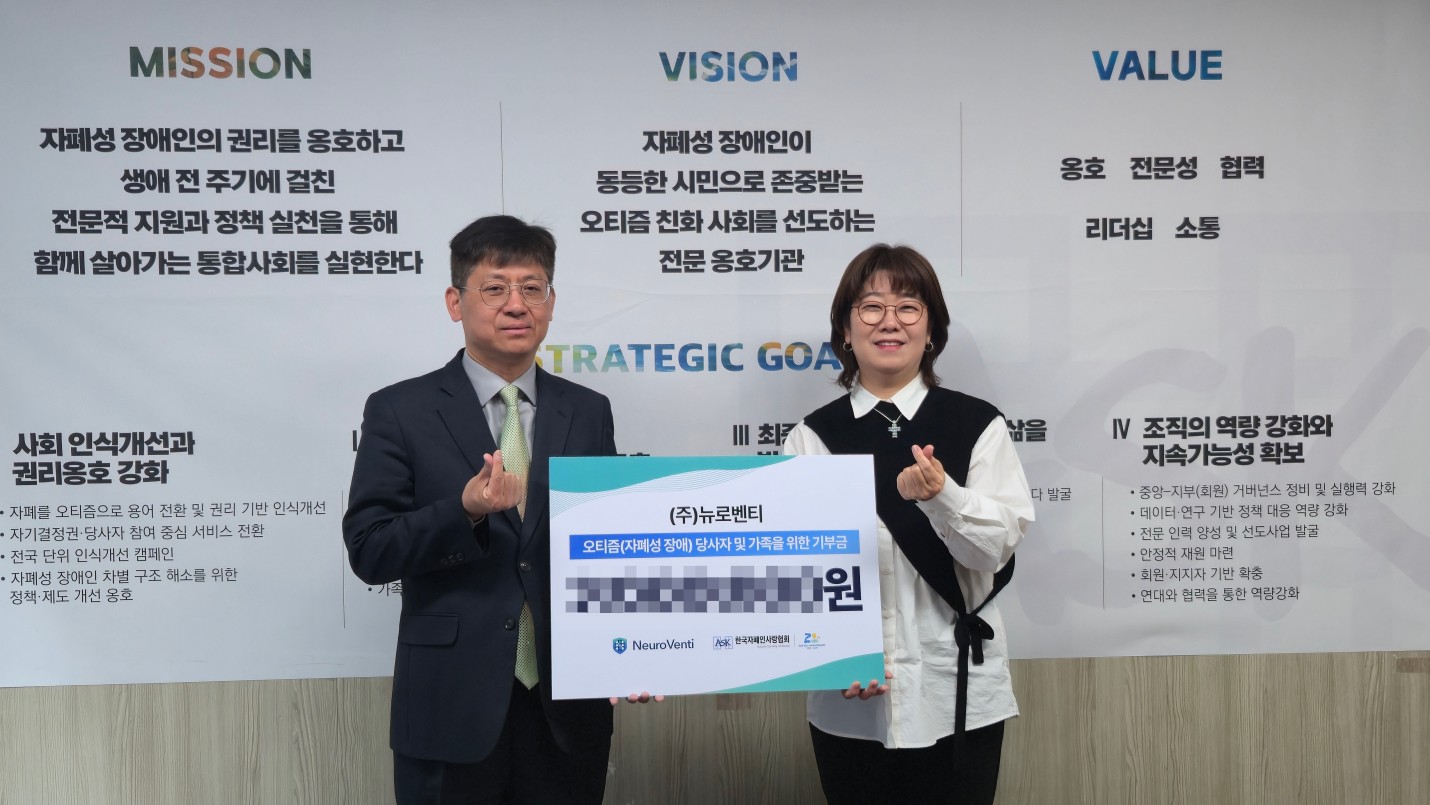 지난 3월 26일, 뉴로벤티는 자폐성 장애(오티즘)에 대한 우리 사회의 이해와 공감을 넓히는 데 작은 힘을 보태고자 한국자폐인사랑협회에 인식 개선을 위한 기부금을 전달했습니다.